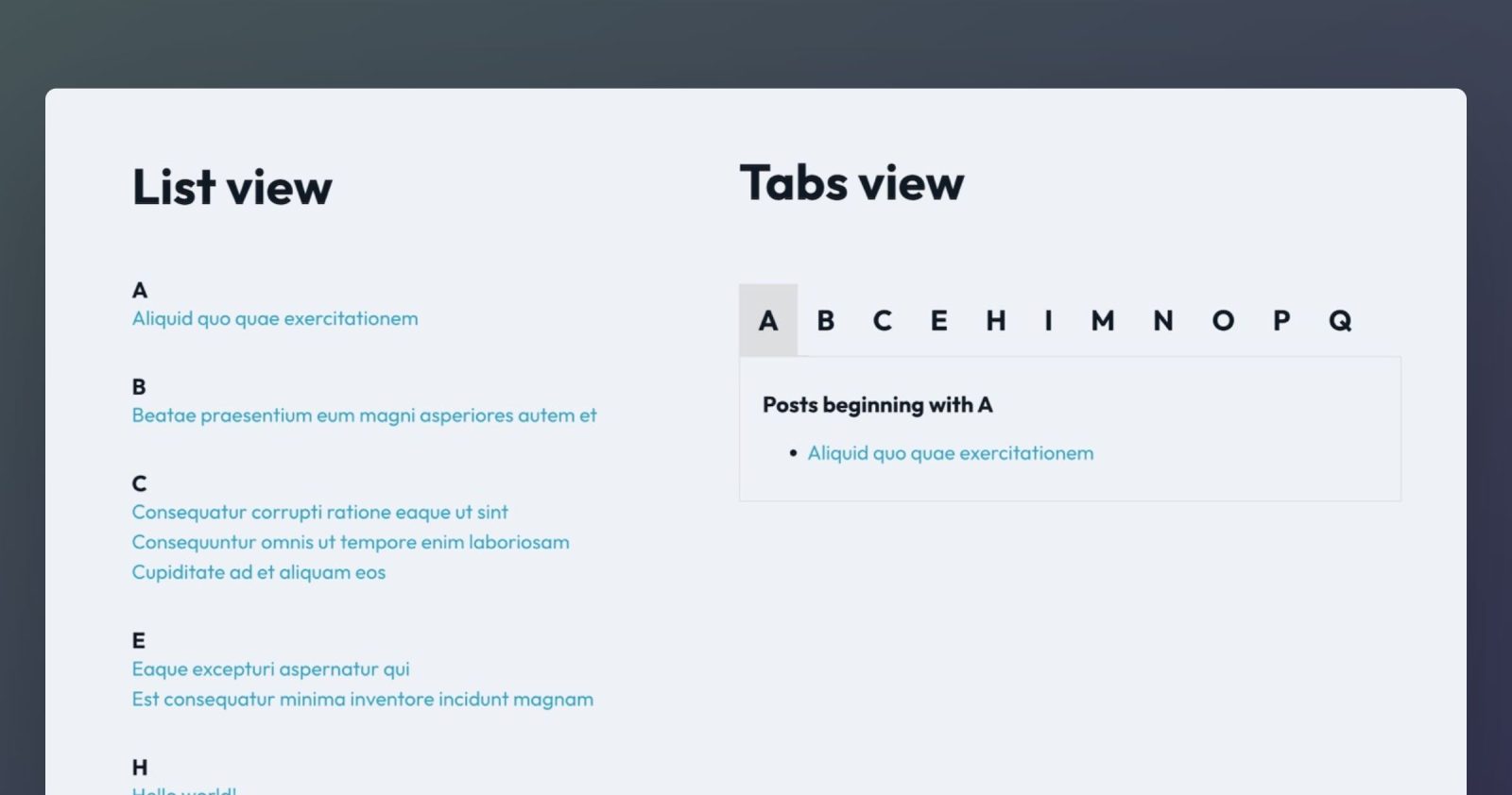 We shall define a custom function that loops through the posts and returns an array with the unique (among the ones that posts start with) alphabets as the keys and the corresponding posts’ array as the values.