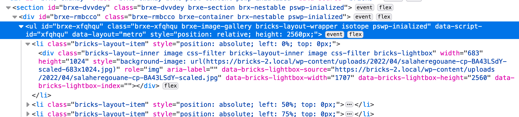 As we can see, the lightbox gets initialized when the clicked element has a class of bricks-lightbox.