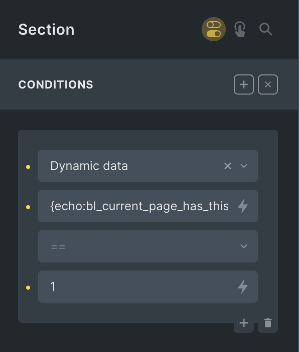 In our example, the element should be rendered only if the current Page being viewed on the front end is either Page 1.1 or Page 1.1.1 and not on any other Page (incl. Page 1 itself).