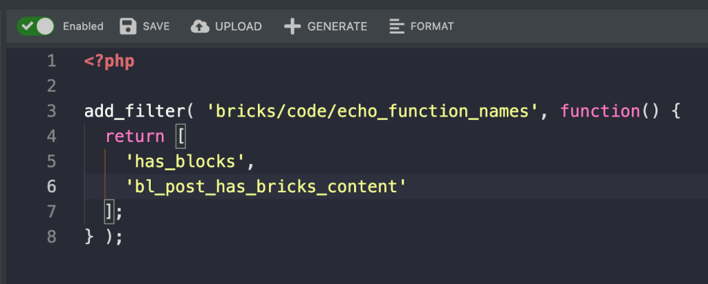 You should also add other functions (native or custom) being used in your Bricks instance besides bl_post_has_bricks_content. This can be checked at Bricks → Settings → Custom code by clicking the Code review button.