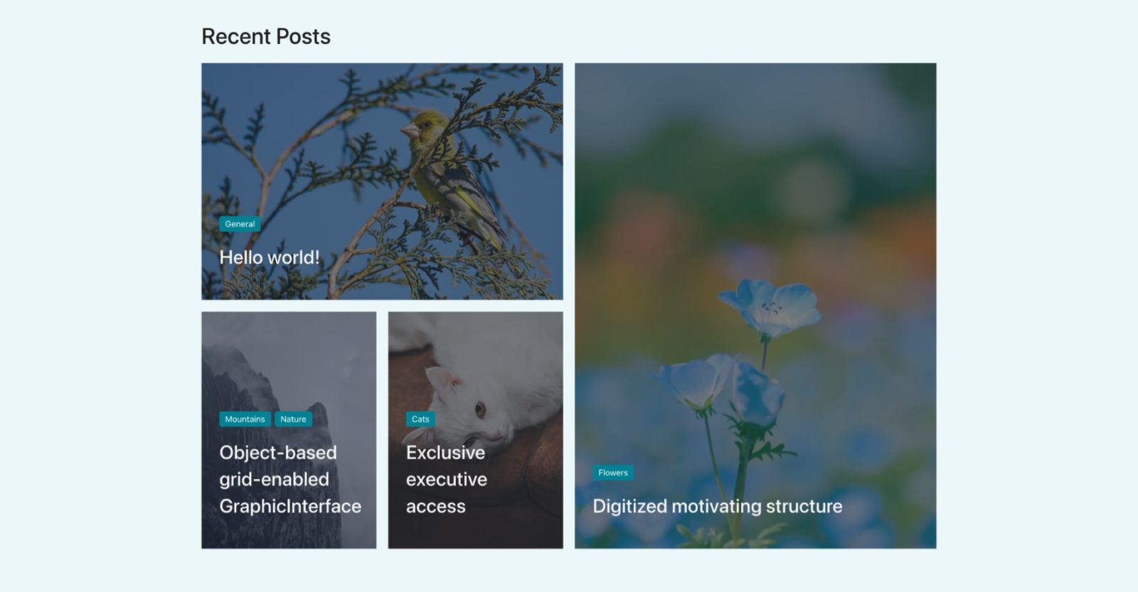 Let us show the post’s categories and title overlayed on top of the featured image for each post.