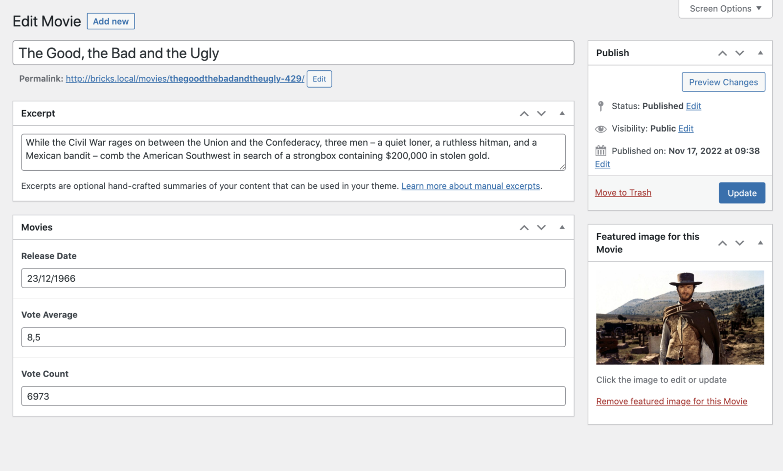 ['backdrop_path']to get the image link and use it as the featured image of our post['title']will be our post title['id']will be used inside the post slug to make sure the post is unique['overview']for the post excerpt['release_date'],['vote_average'], and['vote_count']to fill our ACF custom fields