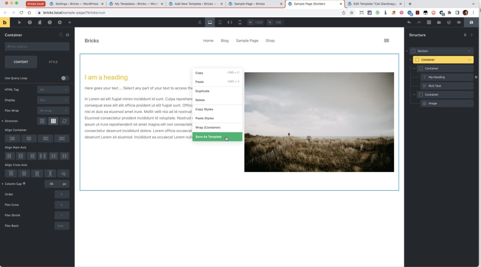 - Right-click on a Section or Container element in the editor and select “Save As Template” option from the context menu.